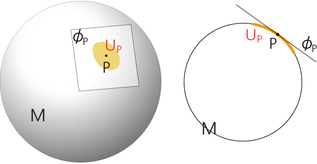 リーマン多様体 \( M\) は,点 \(\ P\) ごとに地図 \(\phi_P \subset \mathbb{R}^n\) をとる。