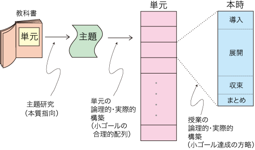 スタートからゴールまでの階梯 (「主題指導の4段階」) を設計 この階梯を複数の授業に配分 |
