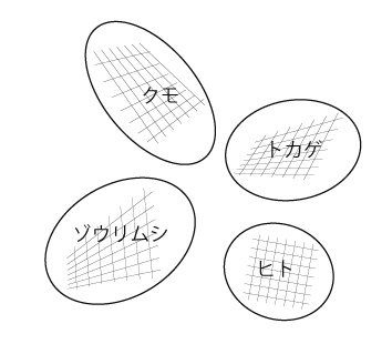 ここでは,ヒト,トカゲ,クモ,ゾウリムシが一つの空間の部分空間になっている。