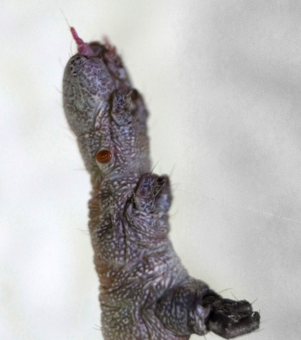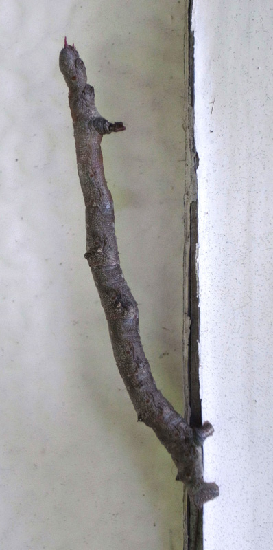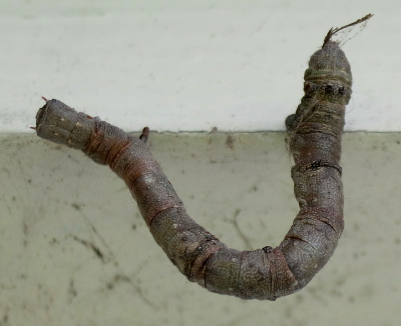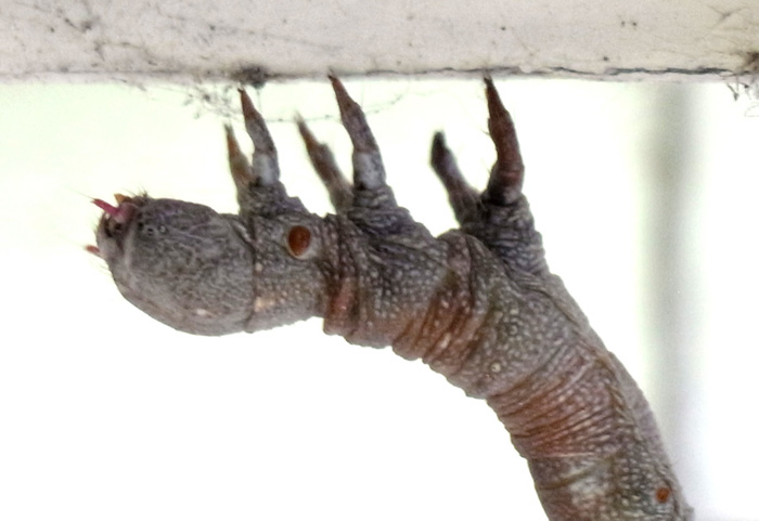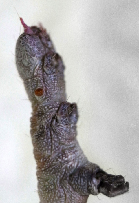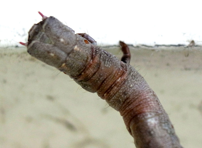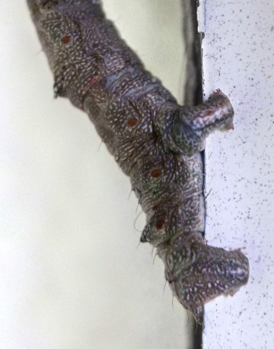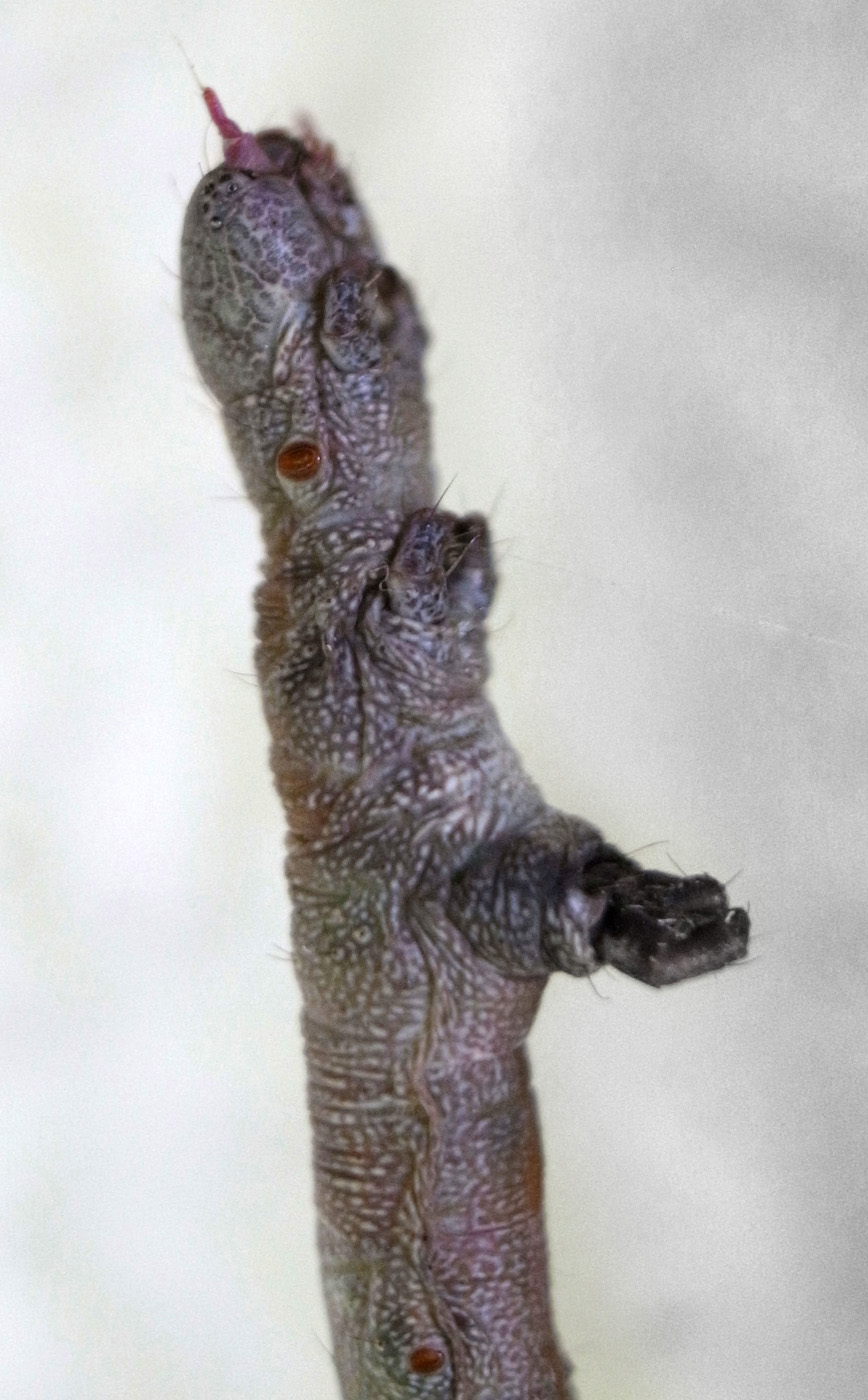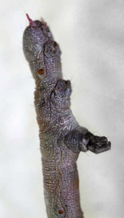 「頭を上に向け触角を前に突き出すような姿勢で静止」(『イモムシハンドブック2』, p.52)