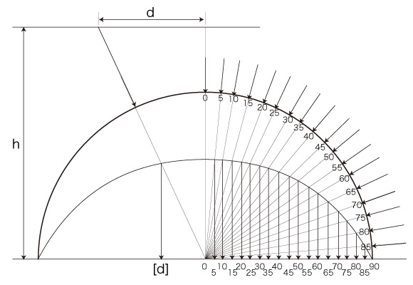 半球面の半径を \( r \) とする。 そして,角度 \( \alpha_d \) と長さ \( r_d \) を,つぎのように措く: