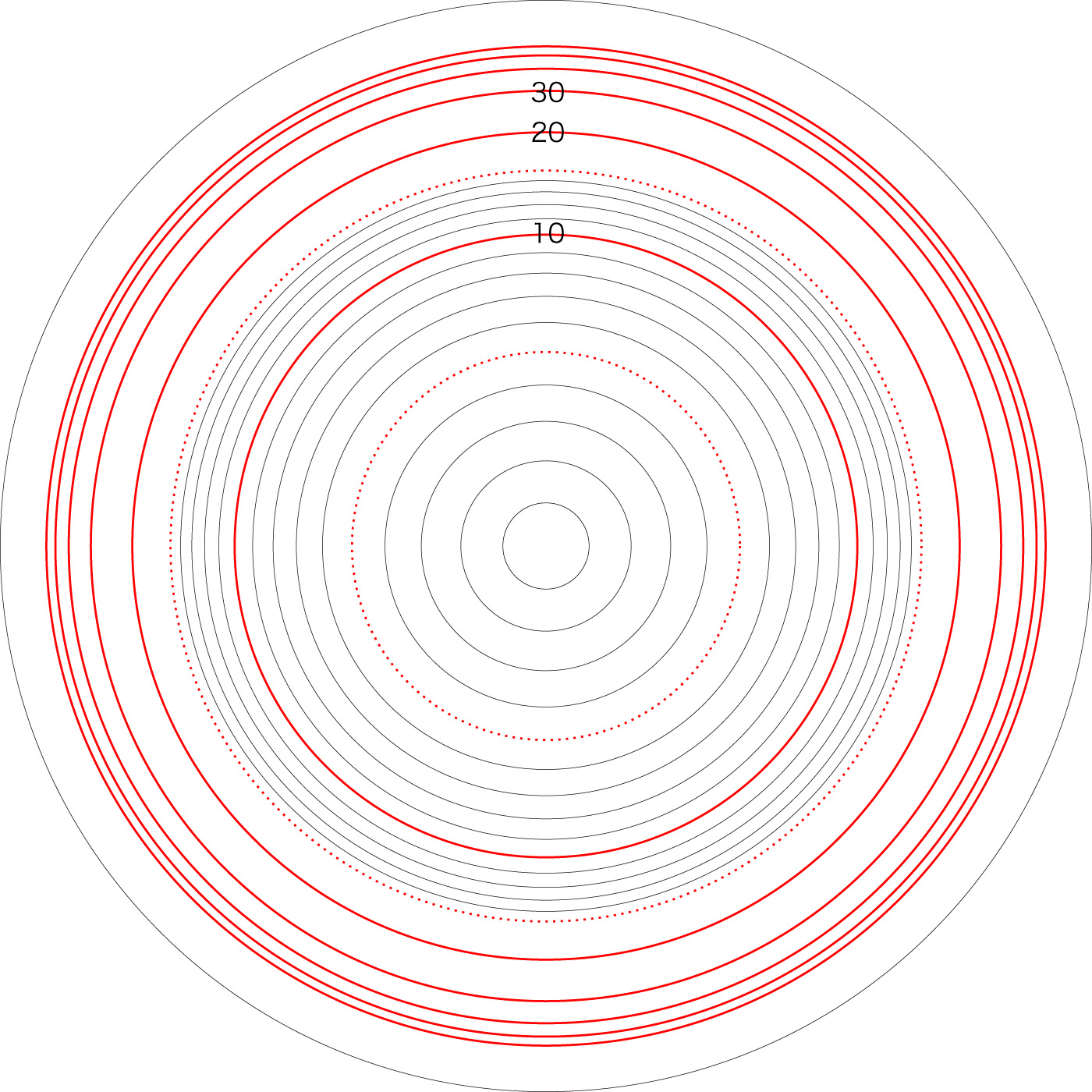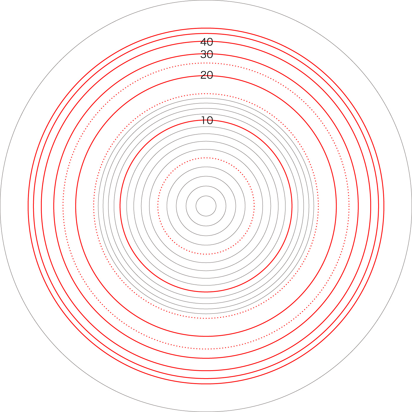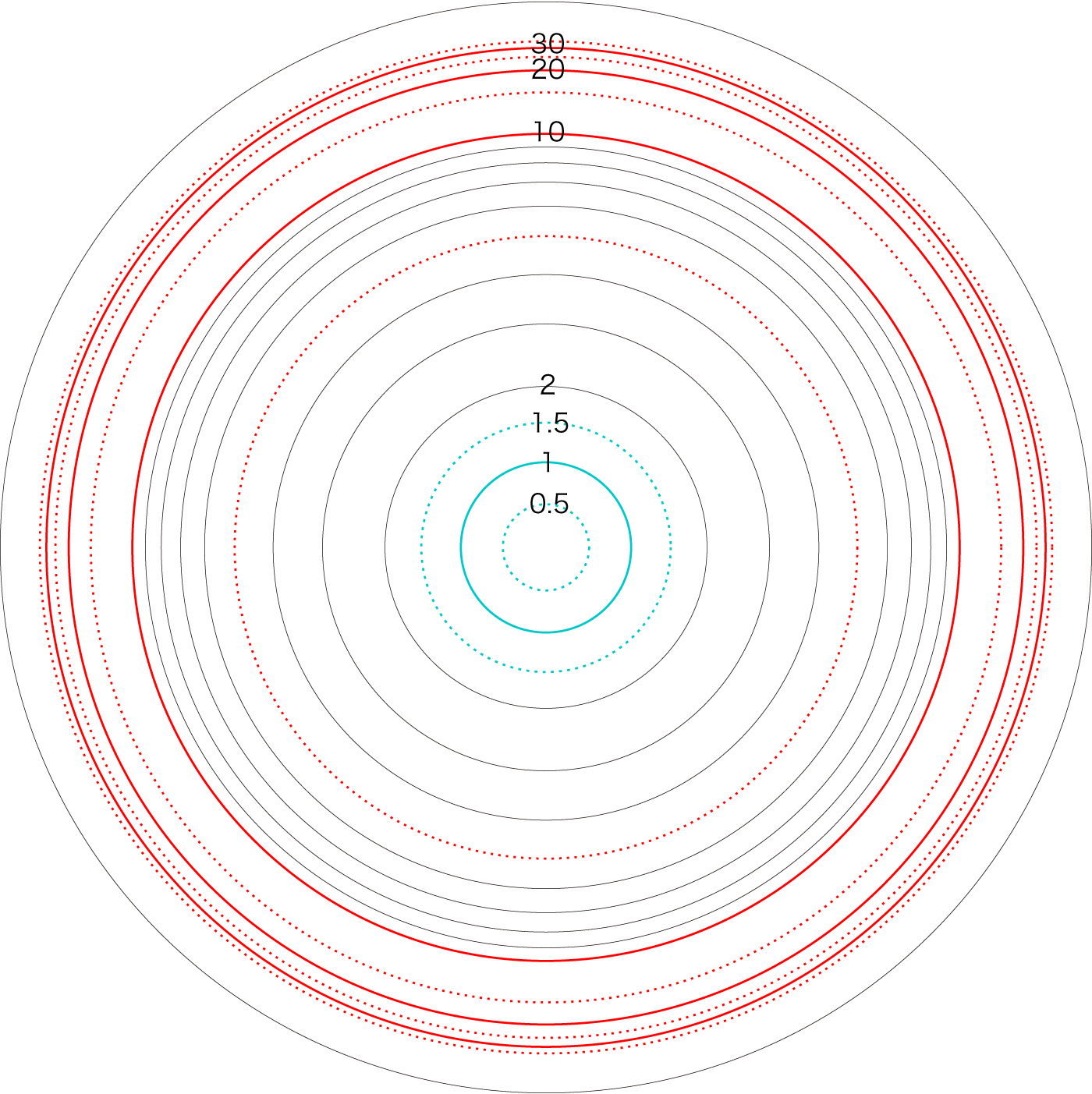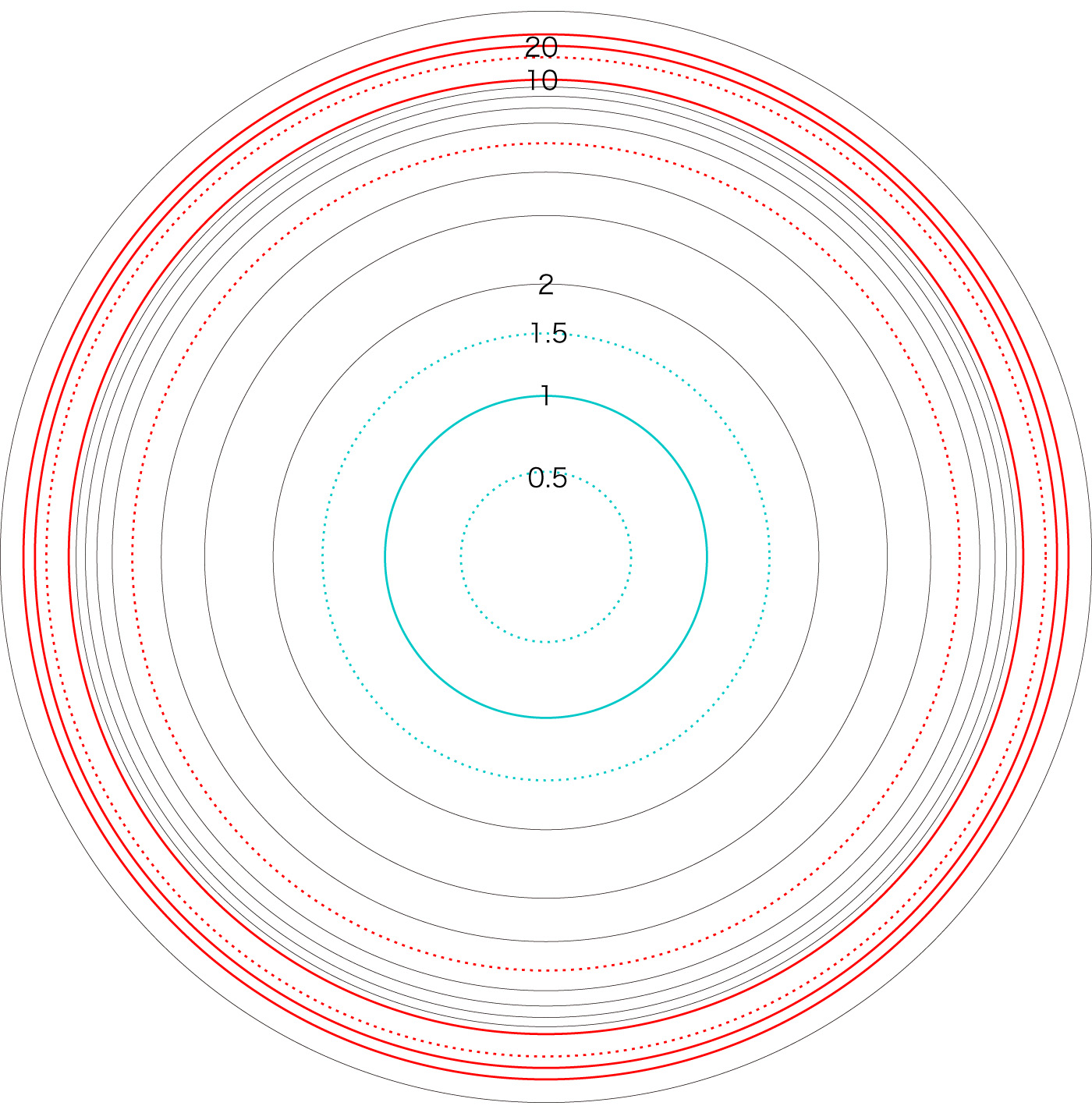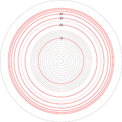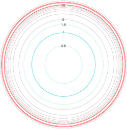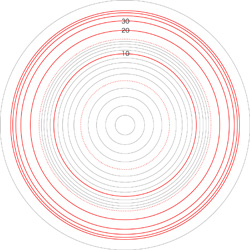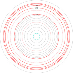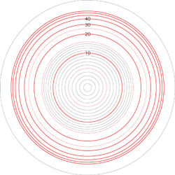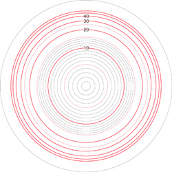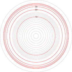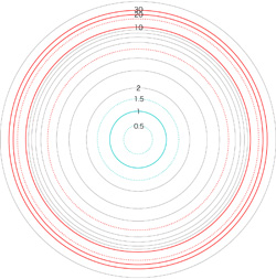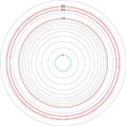 この関係により,高度\( h \) を固定したときの距離座標を作成することができる。 ここでは,高度1〜15 km まで1km おきに,距離座標を作成しておく。 これを適当に縮小/拡大し,レイアーとして撮影画像に重ねて使用する,というわけである。 |