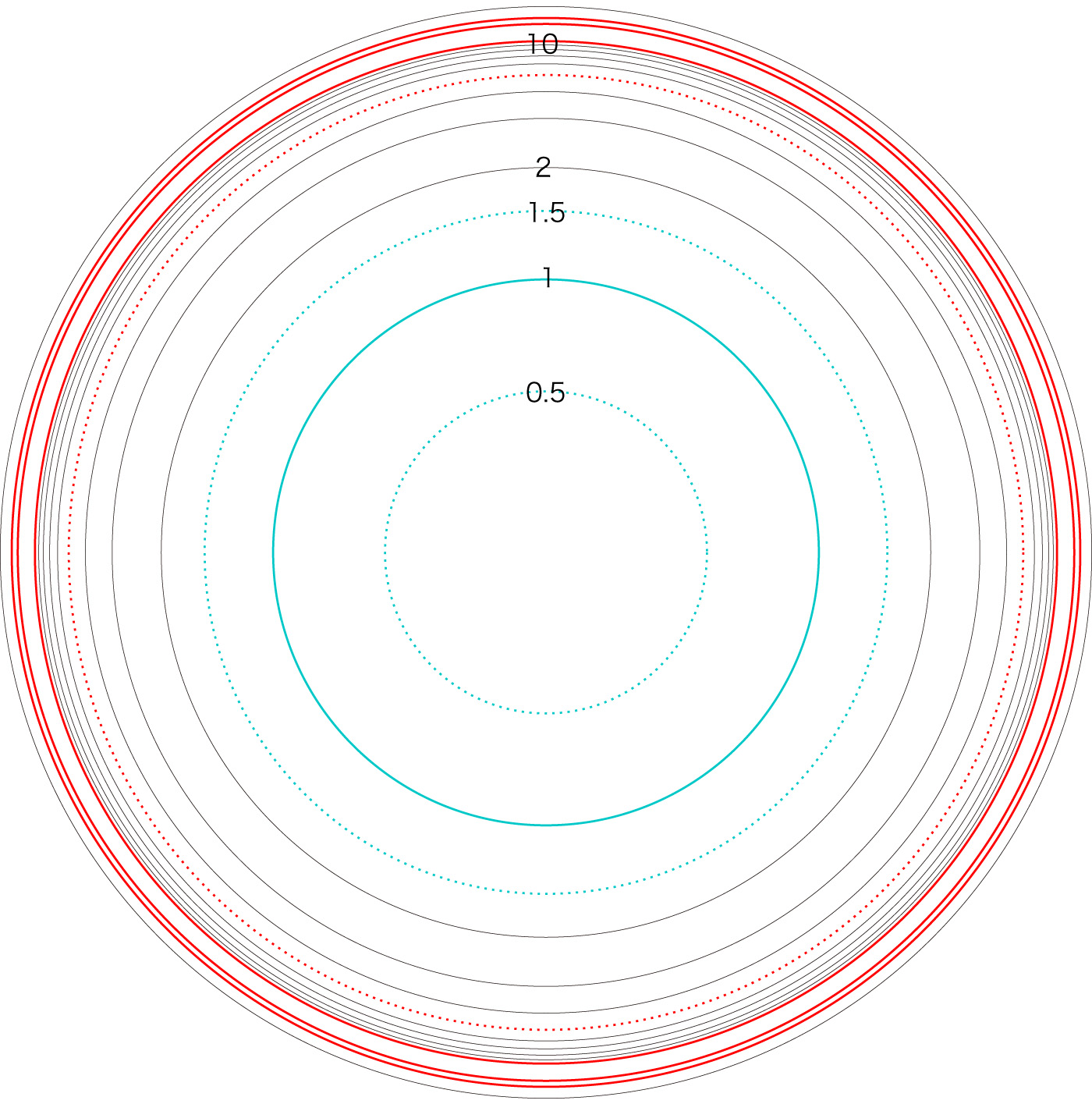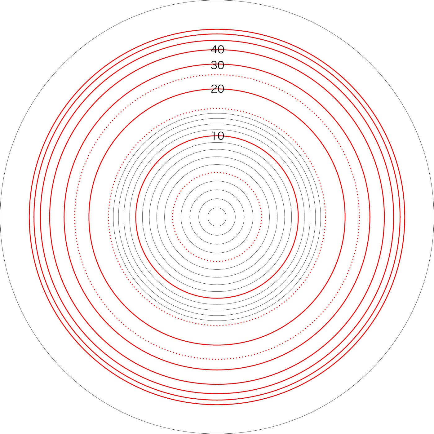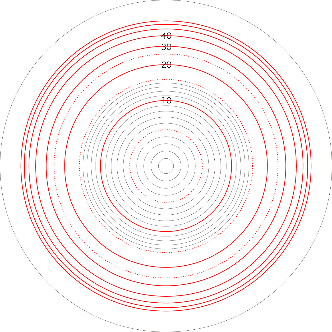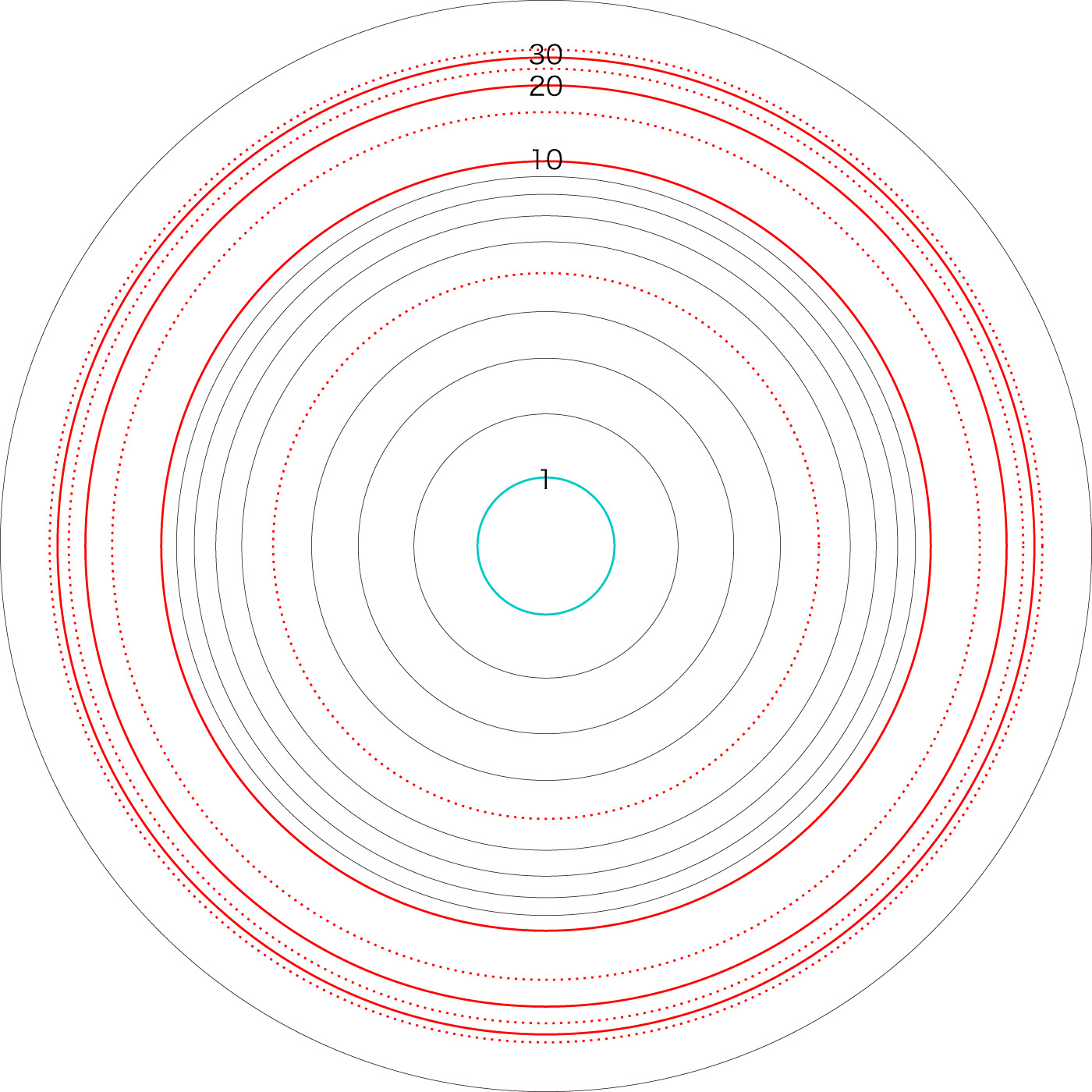 この関係により,高度\( h \) を固定したときの距離座標を作成することができる。 ここでは,高度1〜15 km まで1km おきに,距離座標を作成しておく。 これを適当に縮小/拡大し,レイアーとして撮影画像に重ねて使用する,というわけである。 |