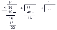 56 4 number 56=5tens and 6 units5 tens 4=1 ten and 1ten remainde, i.e. units becam 16 units16 units 4=4unitsThen, 56 4=14, we can write this as follows: