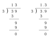 Discuss on each solution. Choose the solution of type (1) as the conclusion : "3.9 is 0.1 multiplied by 39. 0.1 multiplied by 39 devided 3 is 0.1 multiplied by (39 3), which is 0.1 multiplied by 13, or 1.3.