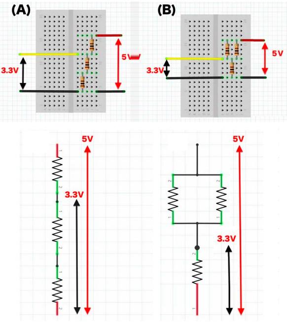 3.3Vは、5Vを 1:2 に分圧してつくる。