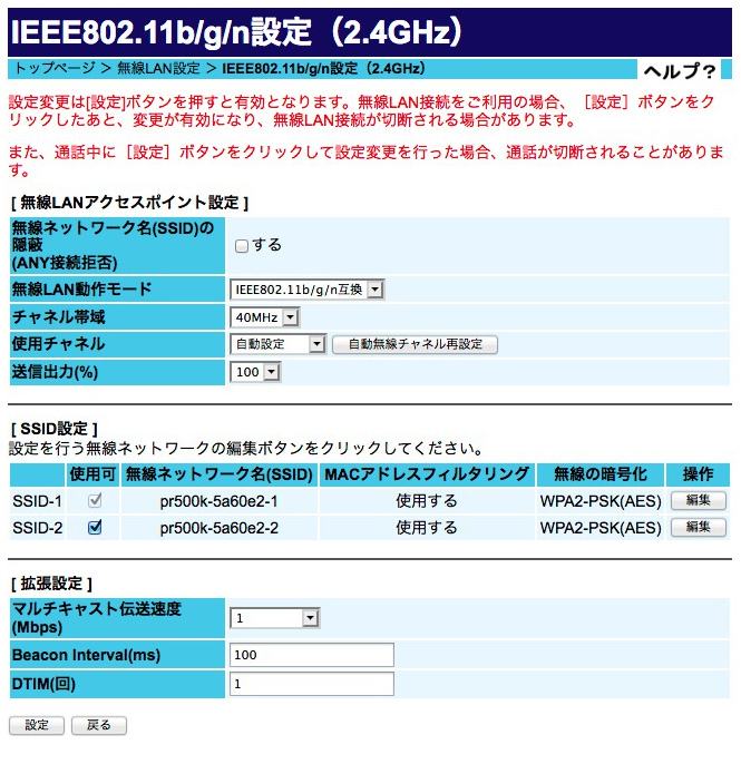 ここでは「ルータ PR-500KI の機能拡張の無線LAN」を例にしているが,つぎのように設定している: