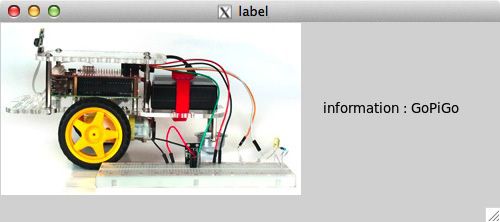 #!/usr/bin/python from tkinter import * from tkinter import ttk from PIL import Image, ImageTk root = Tk() root.geometry('500x200') root.title('label_2') # Frame as widget container frame1 = ttk.Frame(root) frame1.grid() # Image img = Image.open('./gopigo.jpg') img = ImageTk.PhotoImage(img) # Label 1 label1 = ttk.Label( frame1, image=img) label1.grid(row=0, column=0) # Label 2 label2 = ttk.Label( frame1, text='information : GoPiGo', padding=(20)) # (left, top, right, bottom) label2.grid(row=0, column=1) root.mainloop()