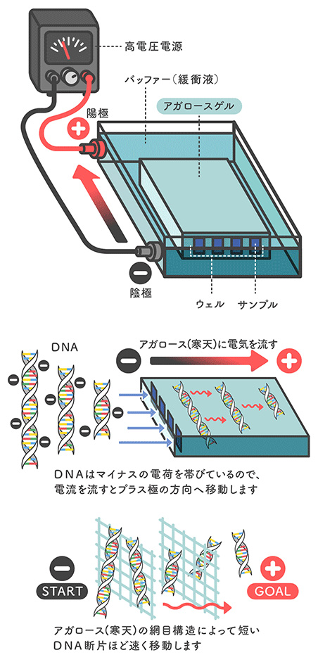 DNAは負の電荷を帯びており,電圧をかけるとアガロースゲル中をプラス極の方向へ移動する。