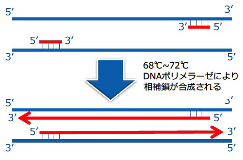 元の長い鎖同士も再結合しようとするが、プライマーの方が短く、圧倒的に量が多いので、元のDNA同士が結合するよりも早く反応が進む