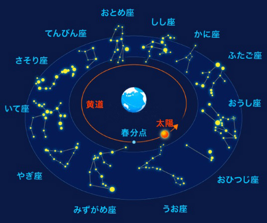 星座の太陽の通り道が "黄道" で,黄道上には12の星座がある。