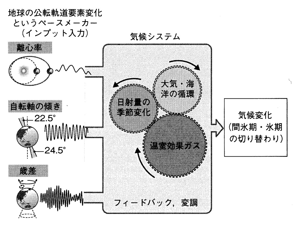 地球は太陽を焦点の一つとする楕円軌道上を公転しているが(ケプラーの第一法則)、その楕円の形状は常に一定ではなく、約10万年をかけて横に伸びた楕円が円に近い楕円となり、そしてまた横に伸びた楕円となっている。