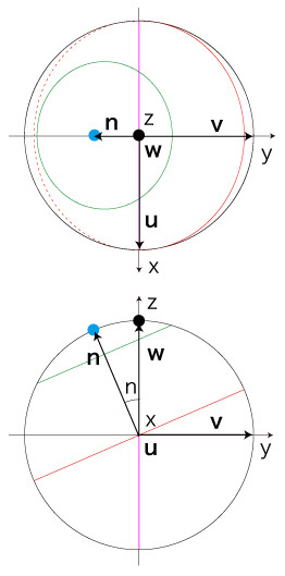 ベクトル \( {\bf u},\ {\bf v},\ {\bf w},\ {\bf n} \) をつぎのようにとる: