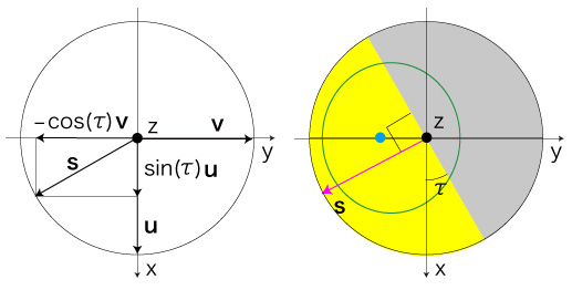 「太陽方向ベクトル \( {\bf s} \)」を,つぎのようにとる: