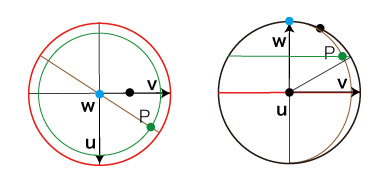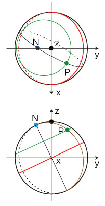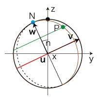 以下,つぎの略記を用いる: \[ \begin{align} n_s = sin(n), &\quad n_c = cos(n) \\ a_s = sin(a), &\quad a_c = cos(a) \\ b_s = sin(b), &\quad b_c = cos(b) \\ \ \\ \end{align} \] , , の座標は: \[ {\bf u} = (1, 0, 0) \\ {\bf v} = (0, cos(n), sin(n)) \\ {\bf w} = (0, -sin(n), cos(n)) \\ \]