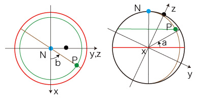 Pの緯度,経度を,それぞれa, bとする: