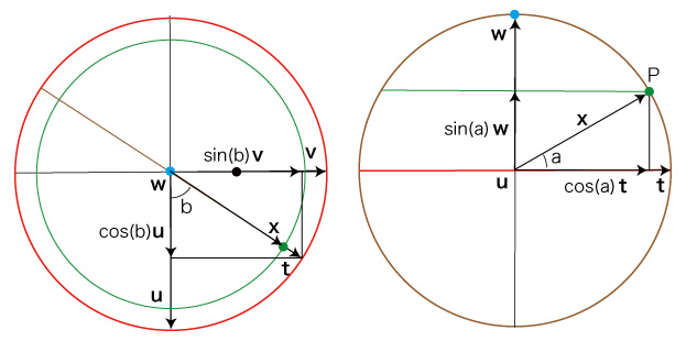 \[ \begin{align} {\bf x} &= cos(a) {\bf t} + sin(a) {\bf w} \\ &= cos(a) ( cos(b) {\bf u} + sin(b) {\bf v} ) + sin(a) {\bf w} \\ &= cos(a) cos(b) {\bf u} + cos(a) sin(b) {\bf v} + sin(a) {\bf w} \\ \ \\ \end{align} \] このベクトルの方程式を,座標の方程式に書き換える。
