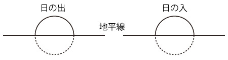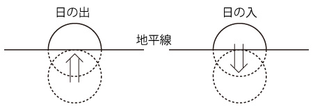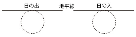 南中から日の入までの時間:6時間5分 アレ,日中時間が12時間よりも9分多い !? 春分は昼夜の時間が同じなのでは? 「12時間ぴったり」では,太陽を点に見ている。 即ち,日の出・日の入の太陽の位置を,つぎのようにしている: ![]() ![]() ![]() なんか長過ぎる感じがする。 計算してみよう。 春分の太陽は,地平線上の真東の点から真西の点へ,180度を12時間で移動する。 角度1分を移動する時間は: