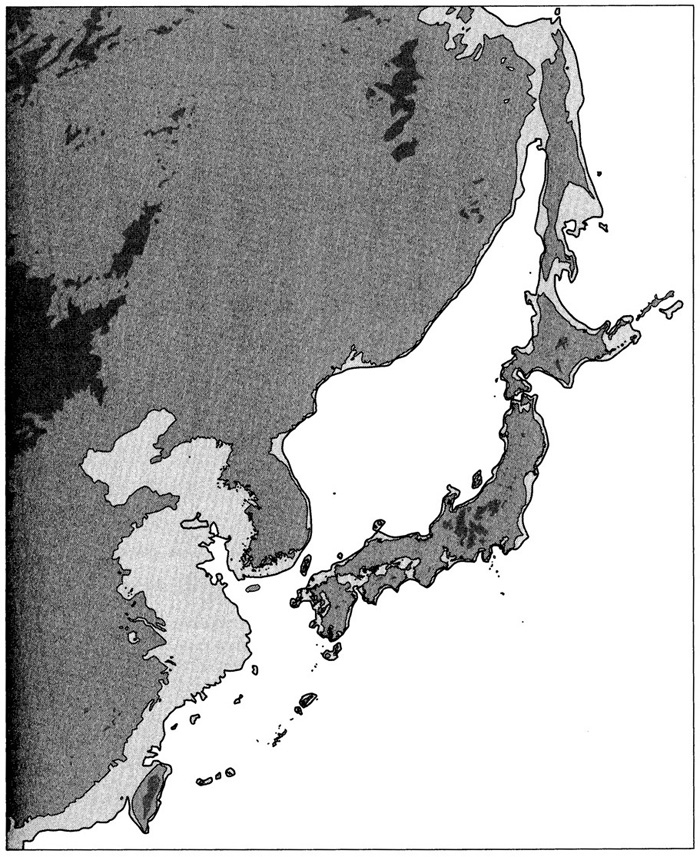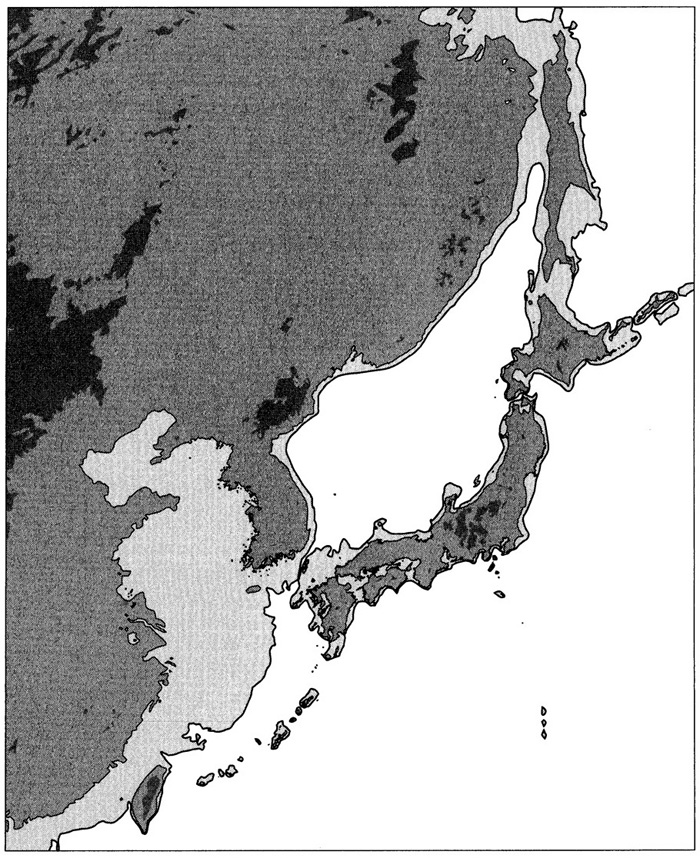 「海面が今より 130m 下がっていた2万年前頃の日本列島」