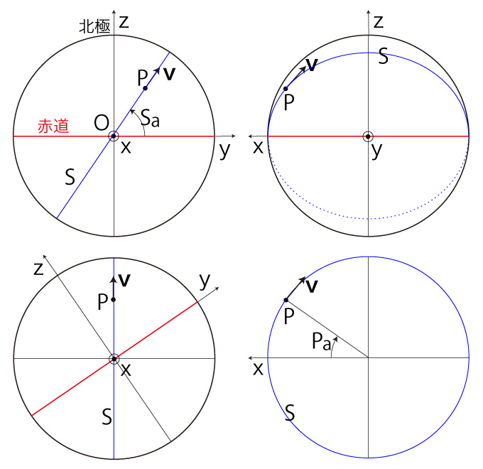 球体上の点 \( P \) とそこでの速度 \( \bf{v} \) に対し,\( P \) を通り \( \bf{v} \) が接ベクトルになる大円を \( S \) とする。