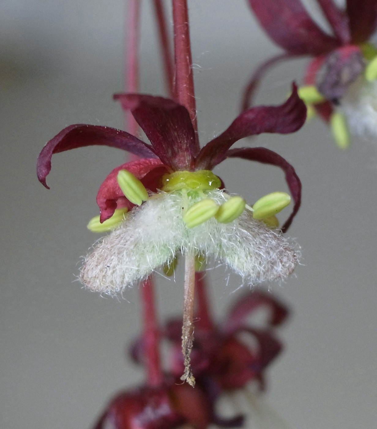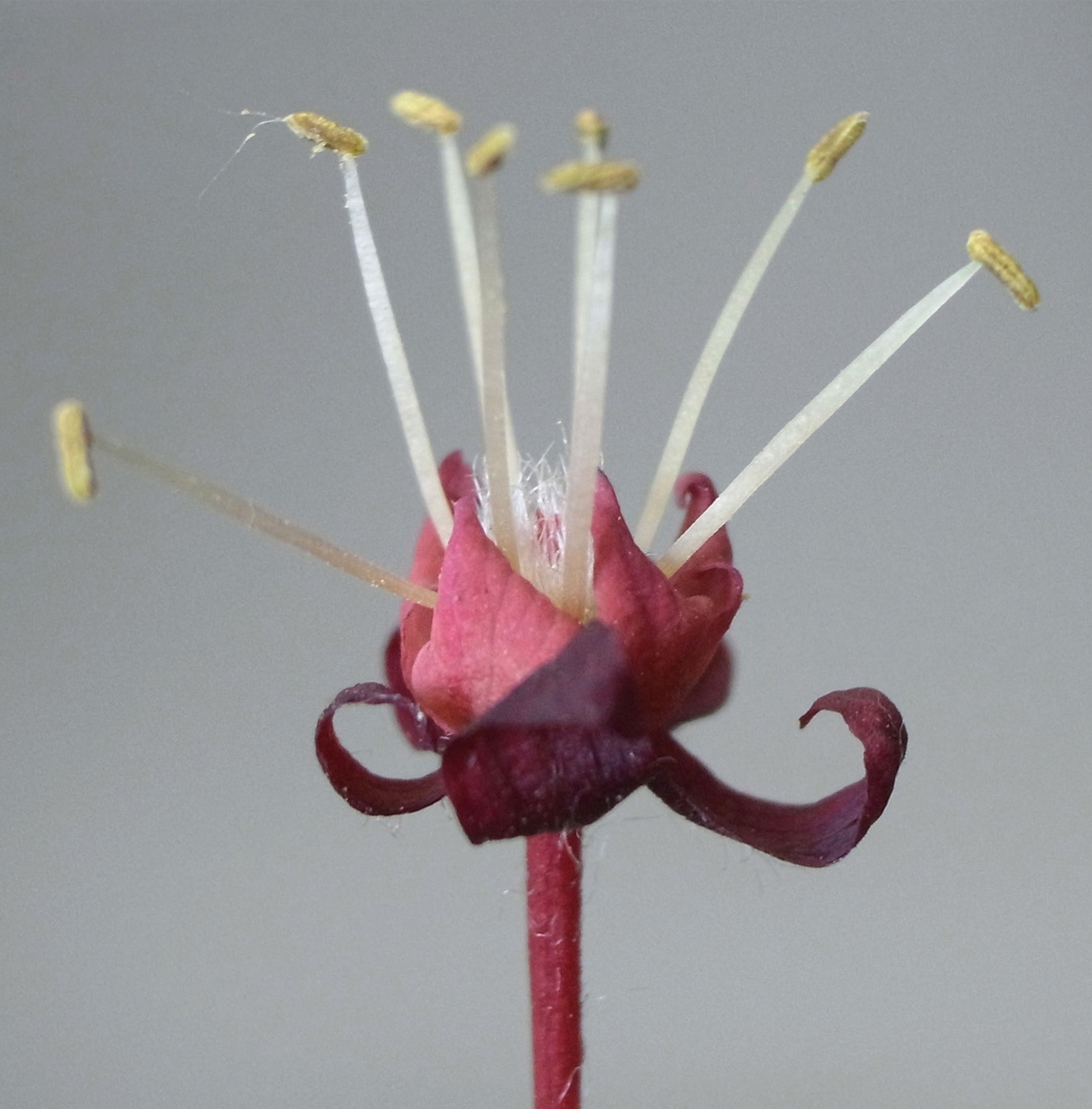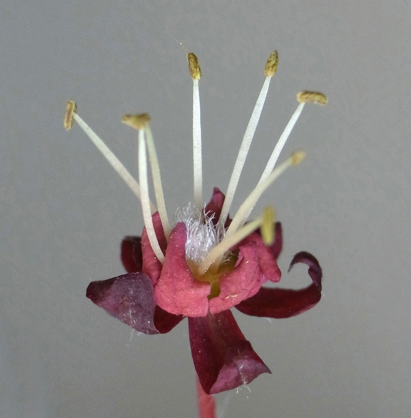 雌花 : 短い花糸をもつ雄しべが8本と,雌しべがある