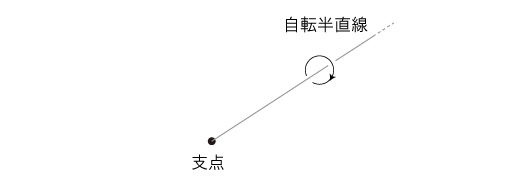 コマの運動は,「自転」である。 英語で言うと, "spin"。 固有の運動として考えるものである。 自転は,半直線の運動に還元される。 半直線の端点が「自転の支点」というわけである。