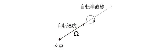 直進運動に対しては,「速度」を導入した。 円運動は,微分によって直進運動に表現されるので,直進運動の速度がこれの速度になる。 同様に,自転運動に対しても「速度」──「 即ち,自転速度Ωを,支点から無限遠点を見たときの自転の角速度 (ベクトル) ── 右回りか左回りか,単位時間あたり何ラジアンか ──で定義する。 そして,つぎのようにベクトル表現する: