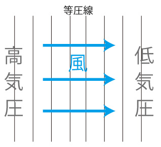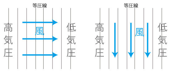 実際は,曲がっていない。 曲げる力のように見えているのは,「見かけの力」」 その後で,風の動きを「地衡風=等圧線に沿って流れる風」として説明する。 しかし,「見かけの力」がどんなにがんばっても,「気圧傾度力によって等圧線と直角に流れる風」を「等圧線と沿って流れる風」にすることはできない。