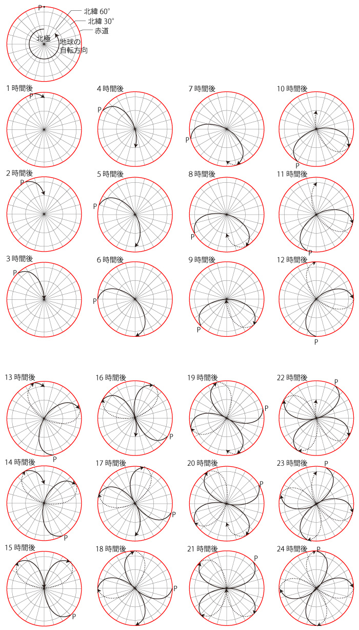 地球が自転しているときと自転していないときの人工衛星の軌道を地上に描くと,自転の効果で軌道が北半球では右方向に曲げられることを確かめることができる. ‥‥