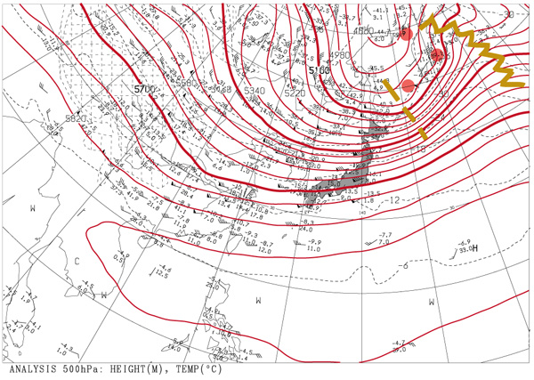 (赤丸は,地上の低気圧の位置)