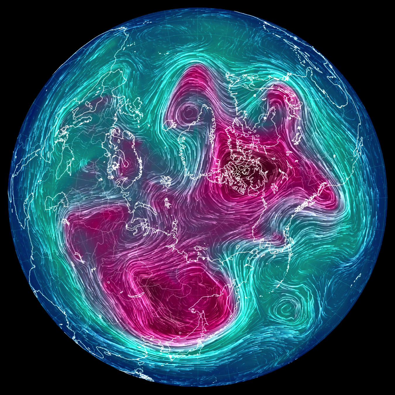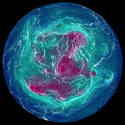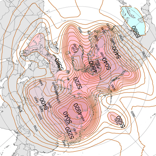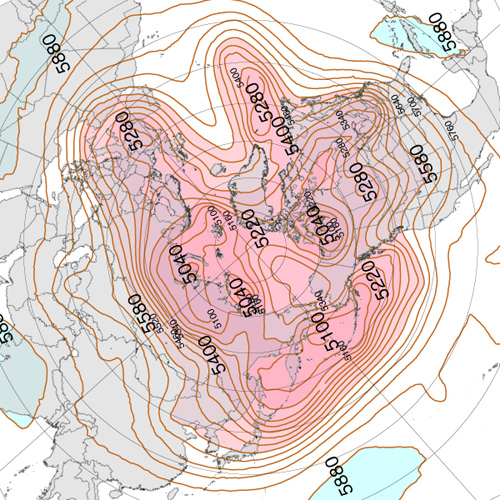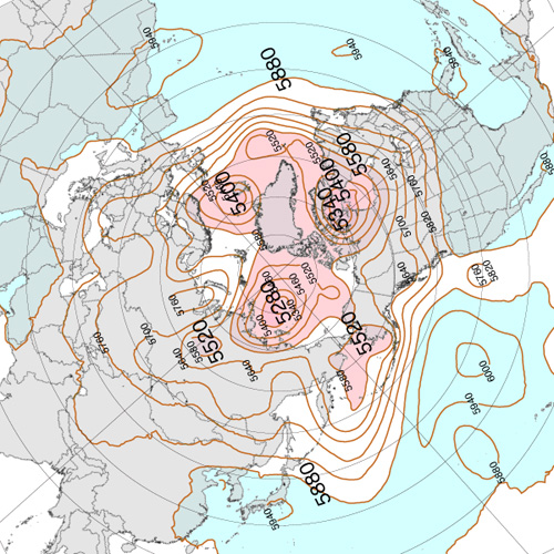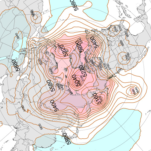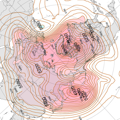 実際,上昇気流と下降気流が束になったこの鉛直対流は,冬は盛んになって低緯度側に拡がり,夏は衰えて高緯度側に後退する。 これを,2022年の 500 hPa 面天気図 (12 UTC) で見ていく。 天気図は,つぎのウェブサイトからダウンロードし,画像編集した: