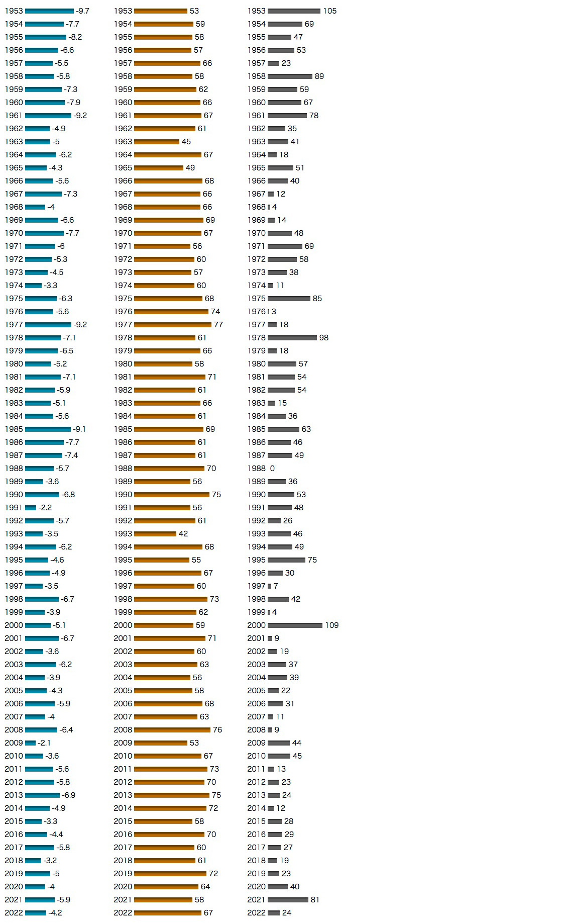 雪は,気温が低いと降るのではない。 実際,気温が低いと降るものなら,氷点下の沙漠には雪が降らねばならない。 そして氷点下の沙漠は,日照時間の多寡を決めるのは気温ではないことも示す。 気象にいくら疎くても,このくらいのロジックはわかるだろう。 降雪は,雪を降らせる雲ができないことには始まらない。 日照時間の多いことは,そのまま降雪の少ないことである。 以下は,釧路 (北海道) と富山 (富山県) の<1月の気温,日照率,降雪の深さの推移>をグラフにしたものである。 このグラフで,つぎのことをしかと確認すべし: 特に,降雪量が大きく変動するものだということを,わかるべし。 変動がわからないと,「温暖化だ!」と騒ぐ者になってしまう。 ──「温暖化だ!」と騒ぐ者に変動が見えないのは,一方向に変化していると信じ込んでいる (洗脳されている) ためである。 |