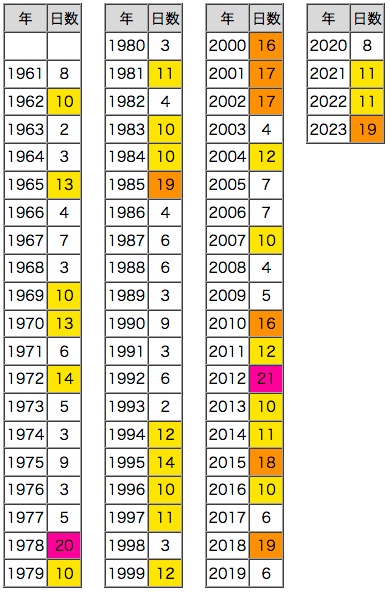紫 : 20日以上,橙 : 20日以上,黄 : 15日以上