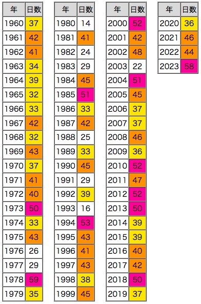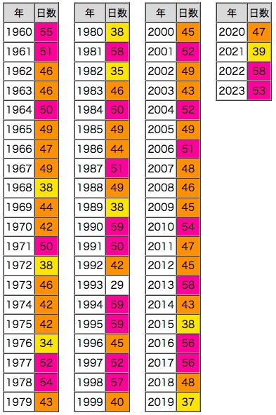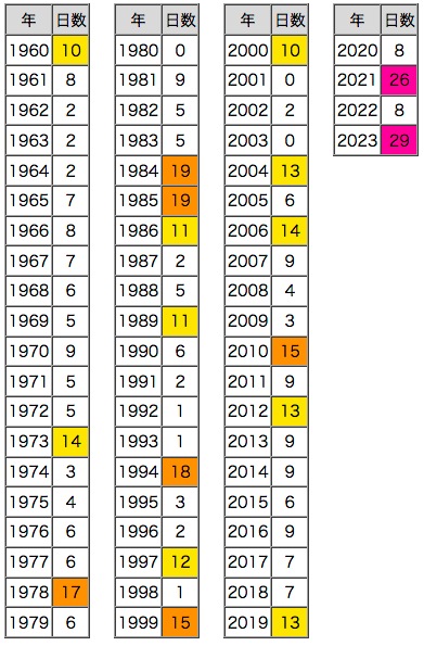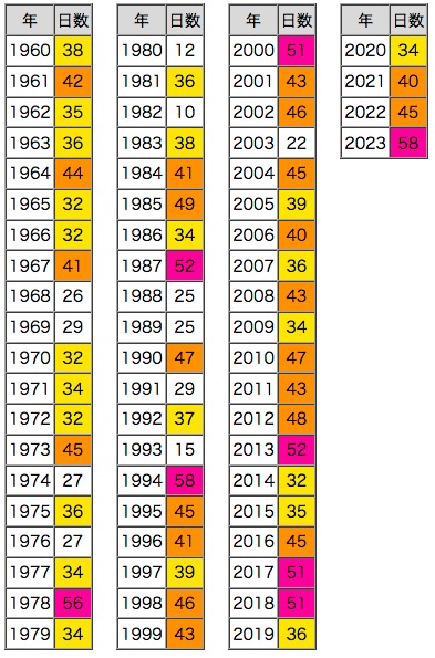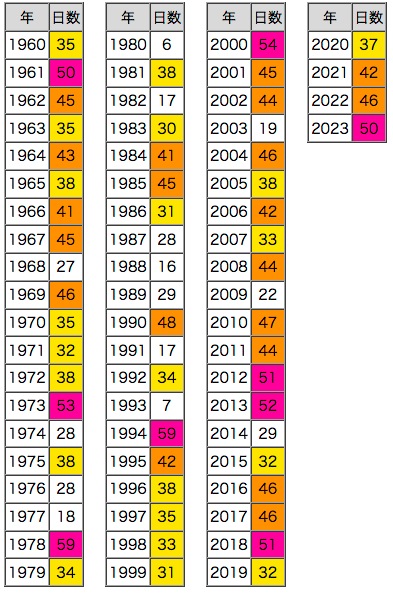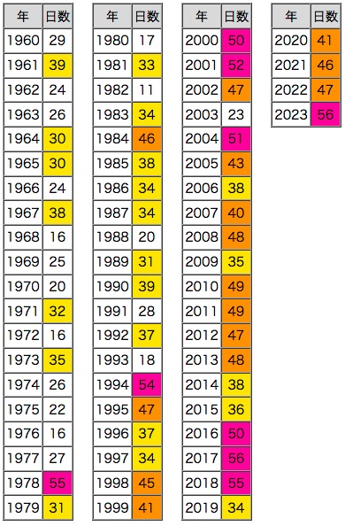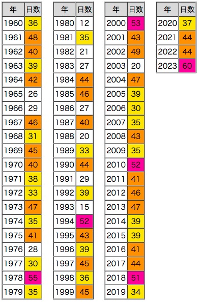 北海道は,気温のベースが低いので,色スケール「紫 : 50日以上,橙 : 40日以上,黄 : 30日以上」だと差が表されされない。
