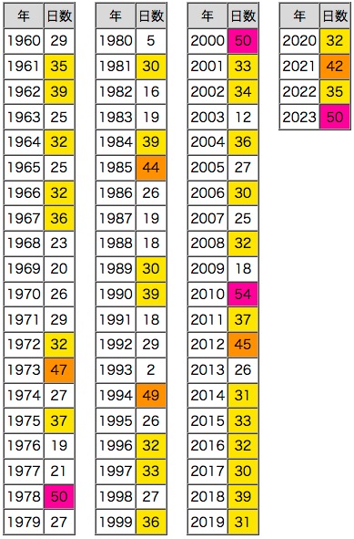 紫 : 50日以上,橙 : 40日以上,黄 : 30日以上