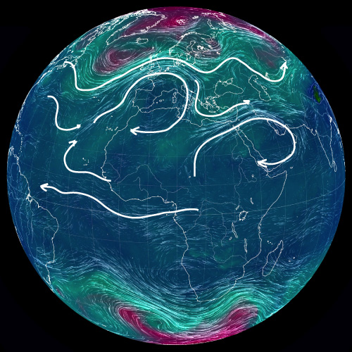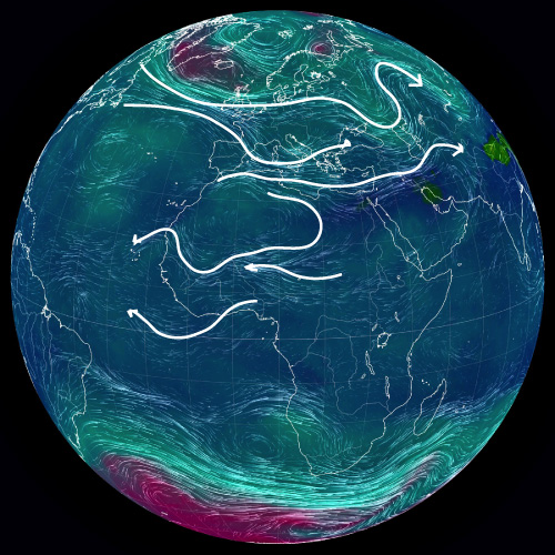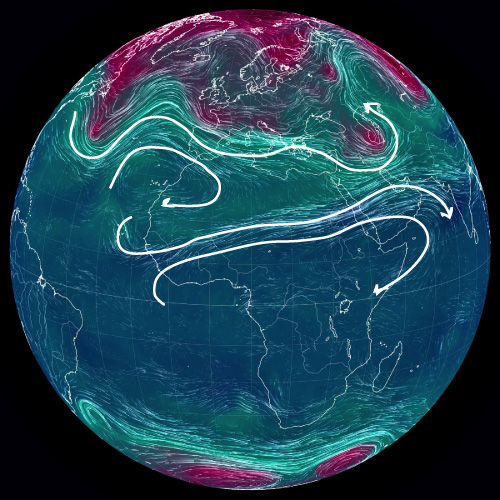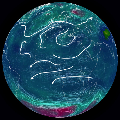 ── 大気の流れを,白の矢線で示す