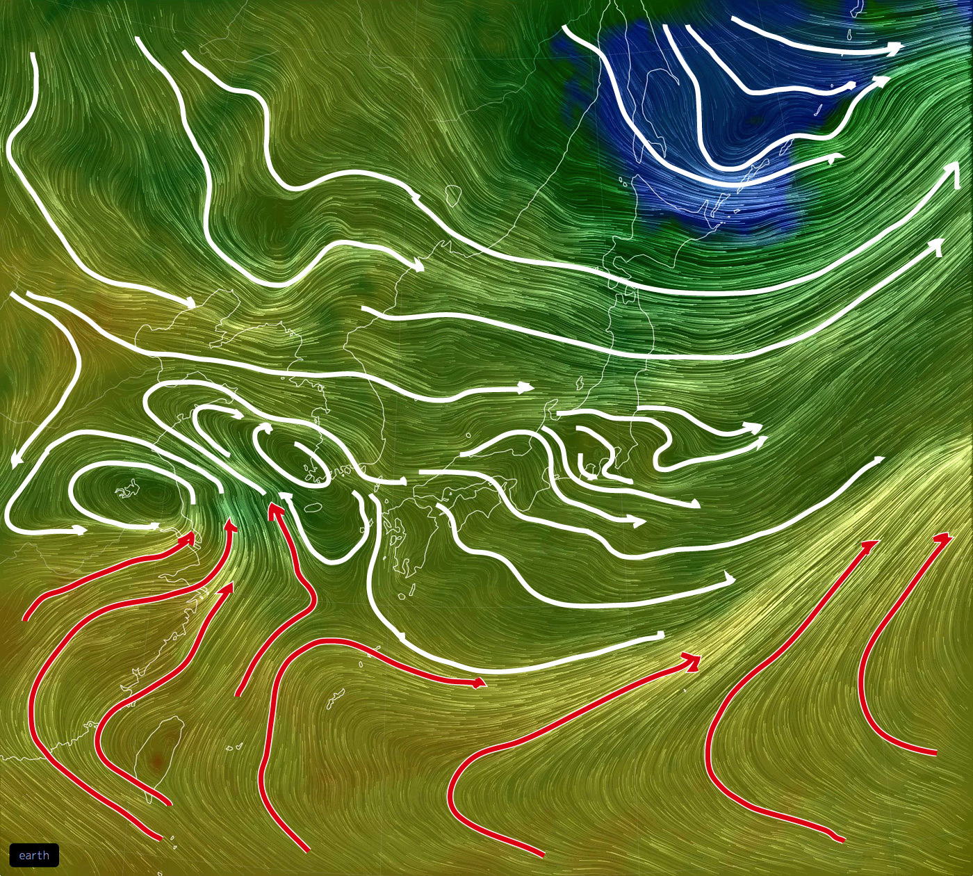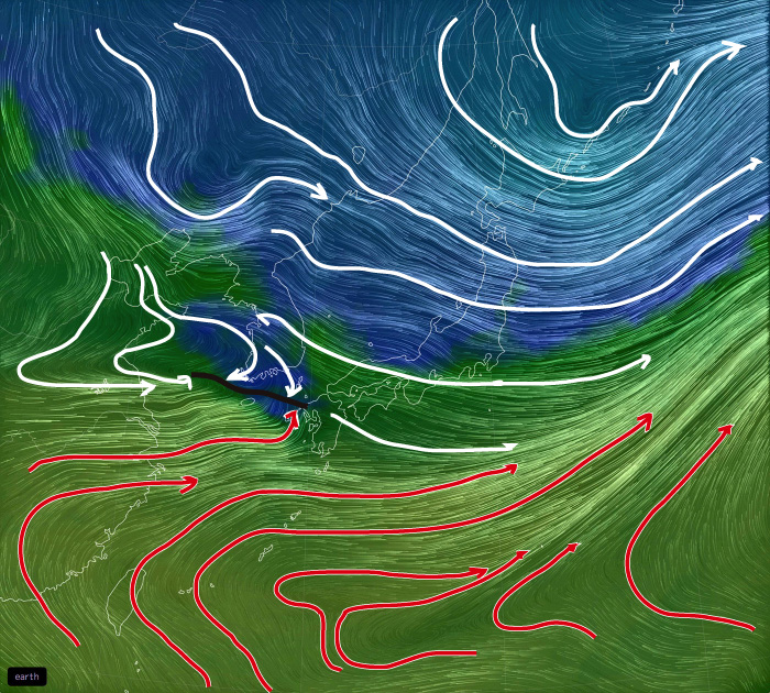 その高度別天気は,相互フィードバックの関係にある。 高層の天気は地上の天気にフィードバックし,地上の天気は高層の天気にフィードバックする。 こうして,たとえ関心があるのは地上の天気だとしても,地上の天気を観るだけでは天気はわからない。 というわけで,高度別の天気図をいろいろ備えることになる。 即ち,高度ごとの天気を,高度別の気象データに表す。 そして高度別気象データを,高度別の天気図として可視化する。 高度別の天気図は,高度が低いほど複雑になる。 理由は: 高度別の天気図は,つぎのようなものになる。 なお,風の流れが見やすいように,特徴的な流線を強調して表す。 |