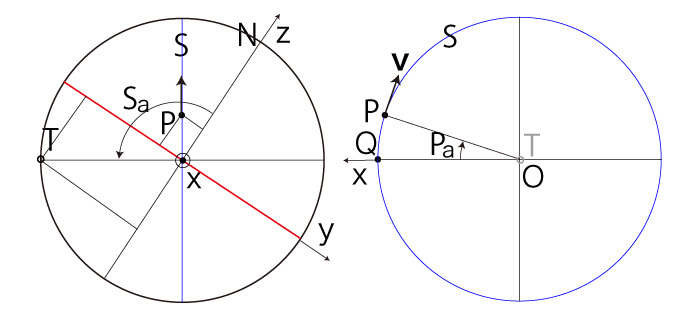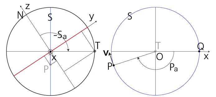 ここでは,\( P,\ \bf{v} \) の座標を表現するためのパラメータ \( (S_a, P_a ) \) を導入する。 \( (P, \bf{v} ) \)-法点を \( T \) とする。 そして,回転角度 \( S_a,\ P_a \) をつぎのように定義する: