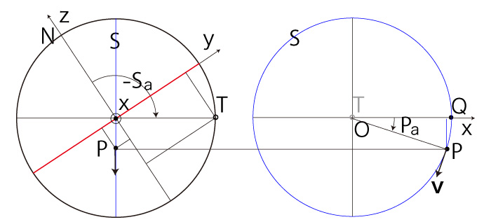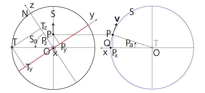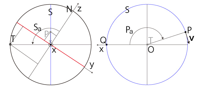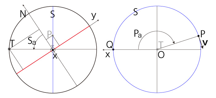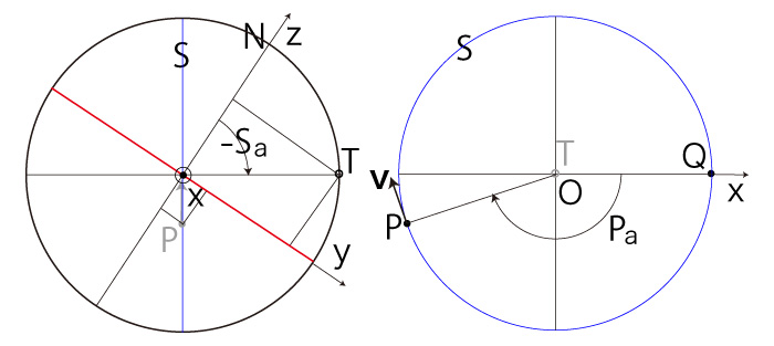 以下に,\( P\, T \) の座標と \( ( S_a,\ P_a ) \) の対応を示す: \( P_z > 0 \) の場合──即ち,\( P \) が北半球にある場合 \( P_x \geqq 0,\ P_y \geqq 0 \) のとき, |