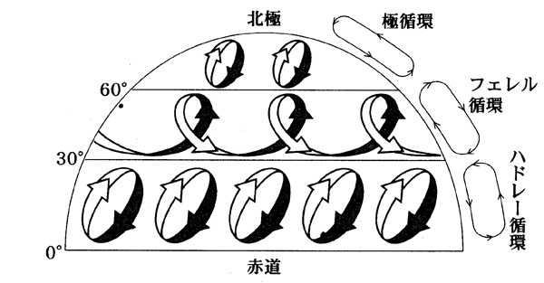 太陽から地球への熱供給は赤道から極に近づくほど少なくなる(熱供給の緯度差)ため、ハドレー循環によって緯度30度付近に中緯度高圧帯、極循環によって緯度60度付近に高緯度低圧帯ができる。‥‥