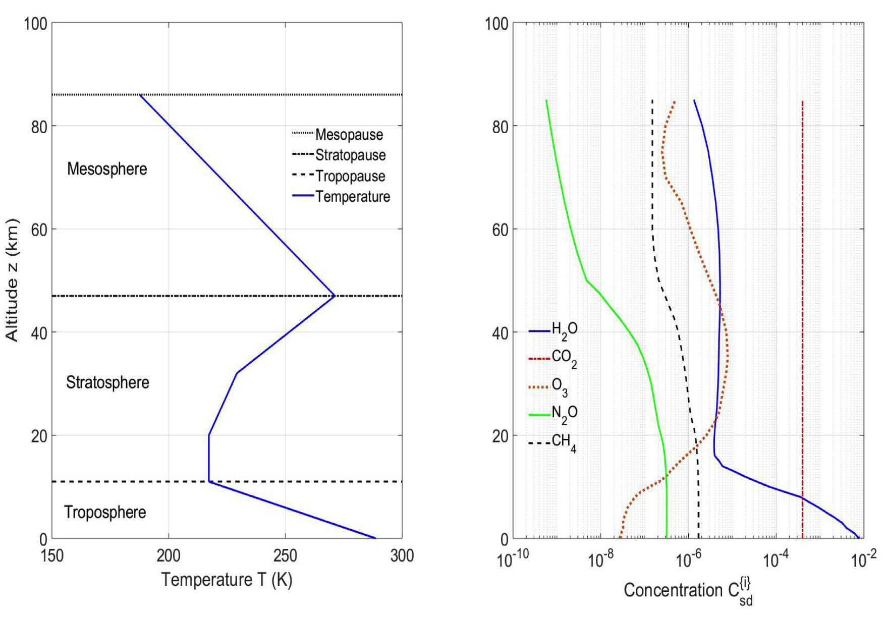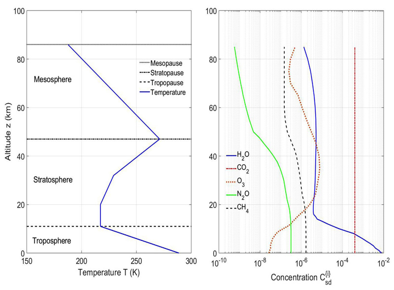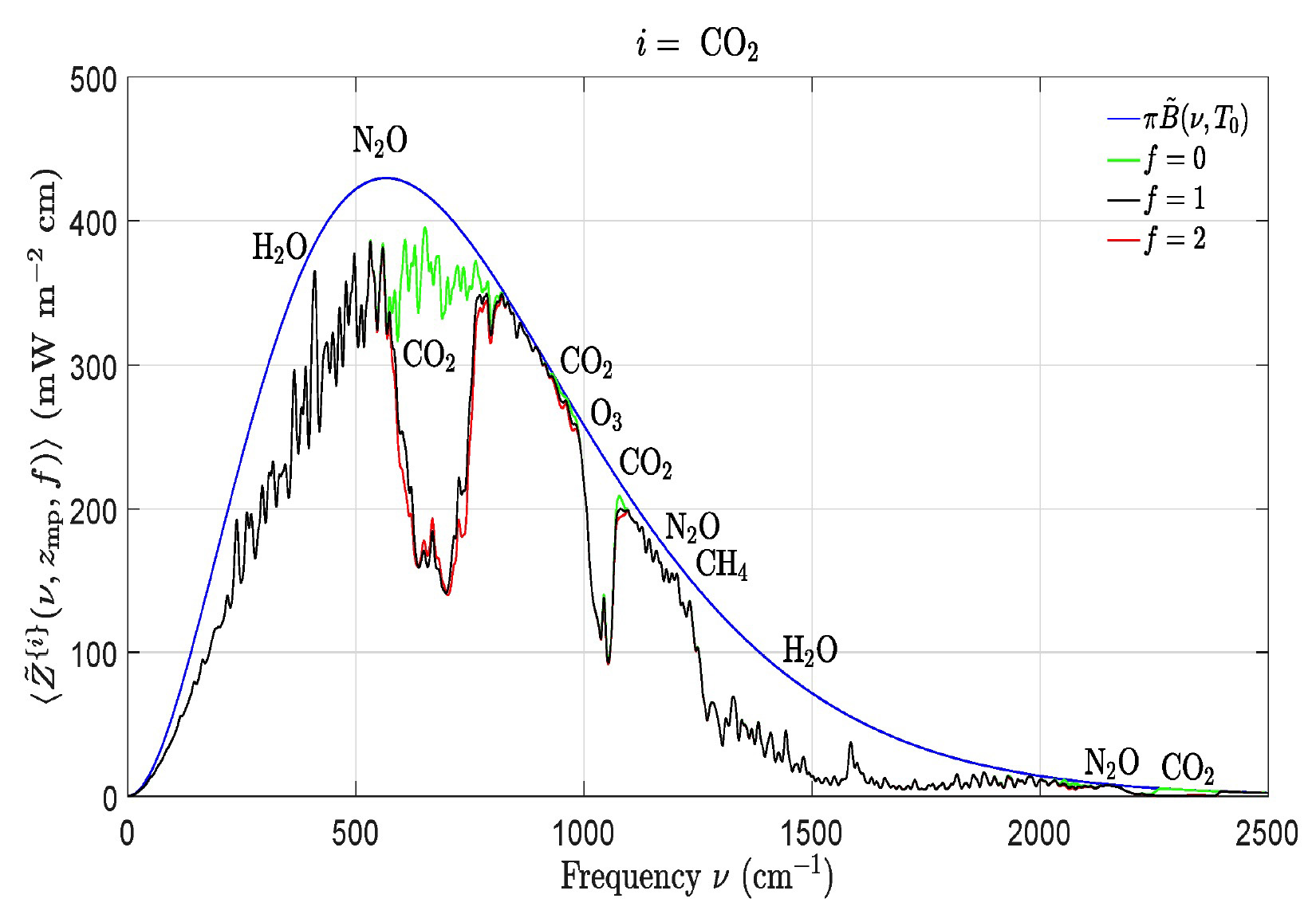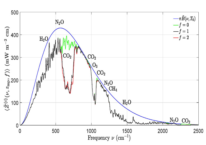 青のなめらかな曲線は,大気が無い場合 緑は,温室効果ガスから CO2 を除いた場合 黒は,温室効果ガスがすべて揃った場合 赤は,CO2 の濃度をいまの2倍にした場合 (黒とさほど変わらず) |