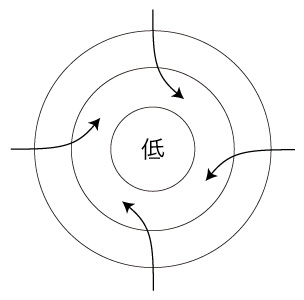 低気圧では,収束する気流の渦の発生が先ずあり,収束点が低気圧になる。